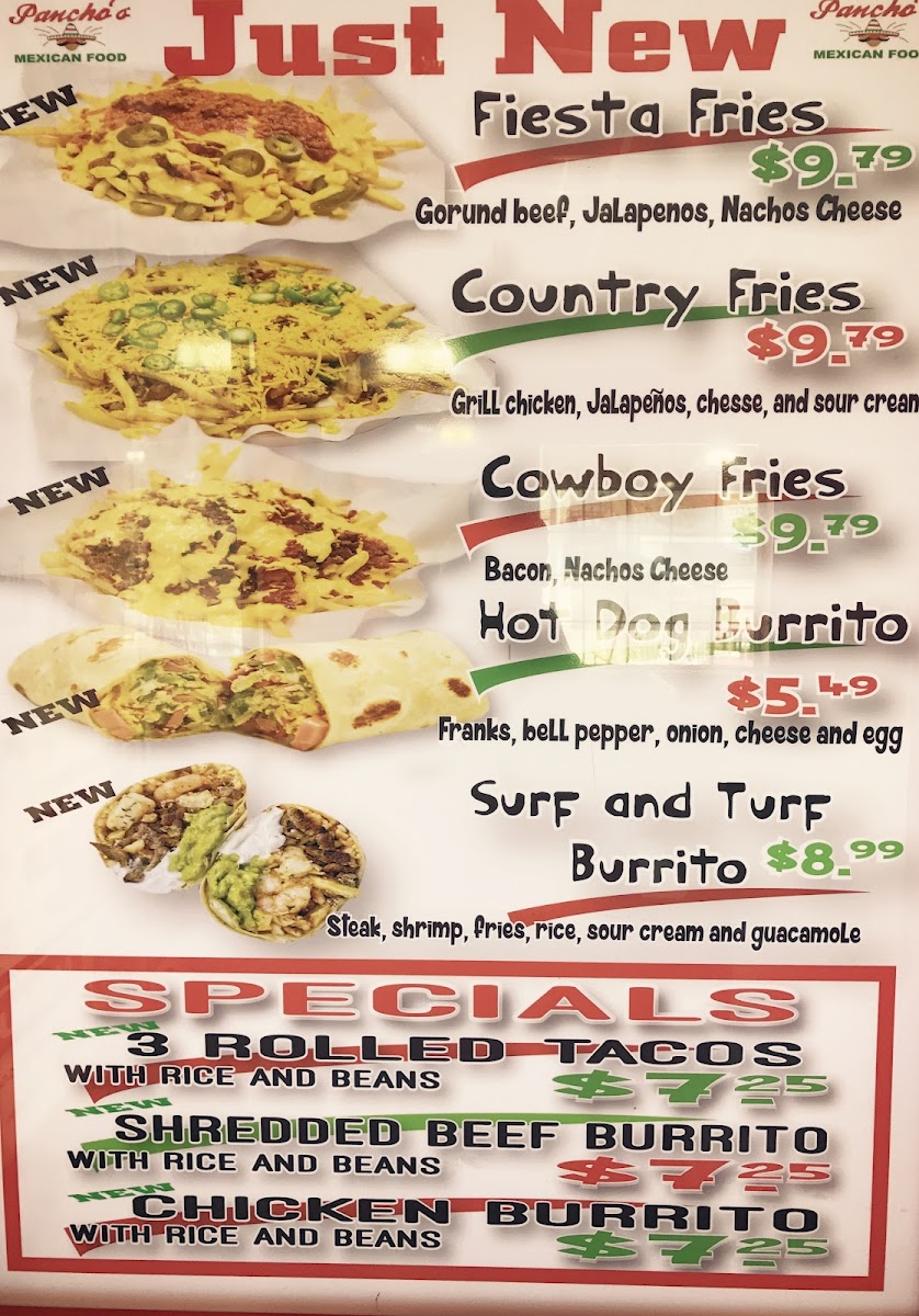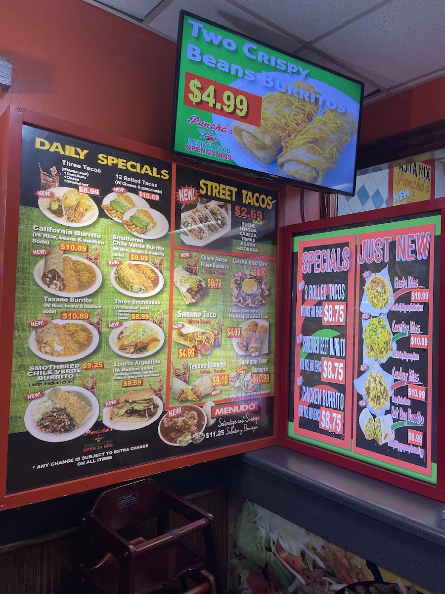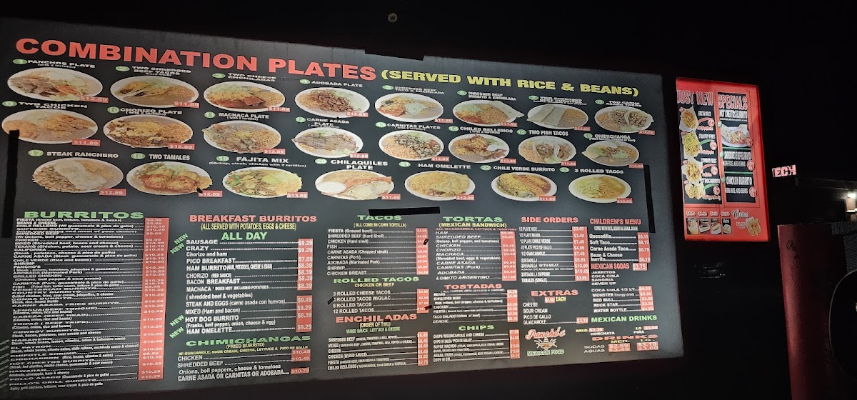 Pancho’s Méxican Food offers a straightforward menu focused on familiar and comforting Mexican dishes. The selection suits casual meals any time of day—from a hearty breakfast featuring menudo to satisfying lunches and dinners with burritos, tacos, and chimichangas.